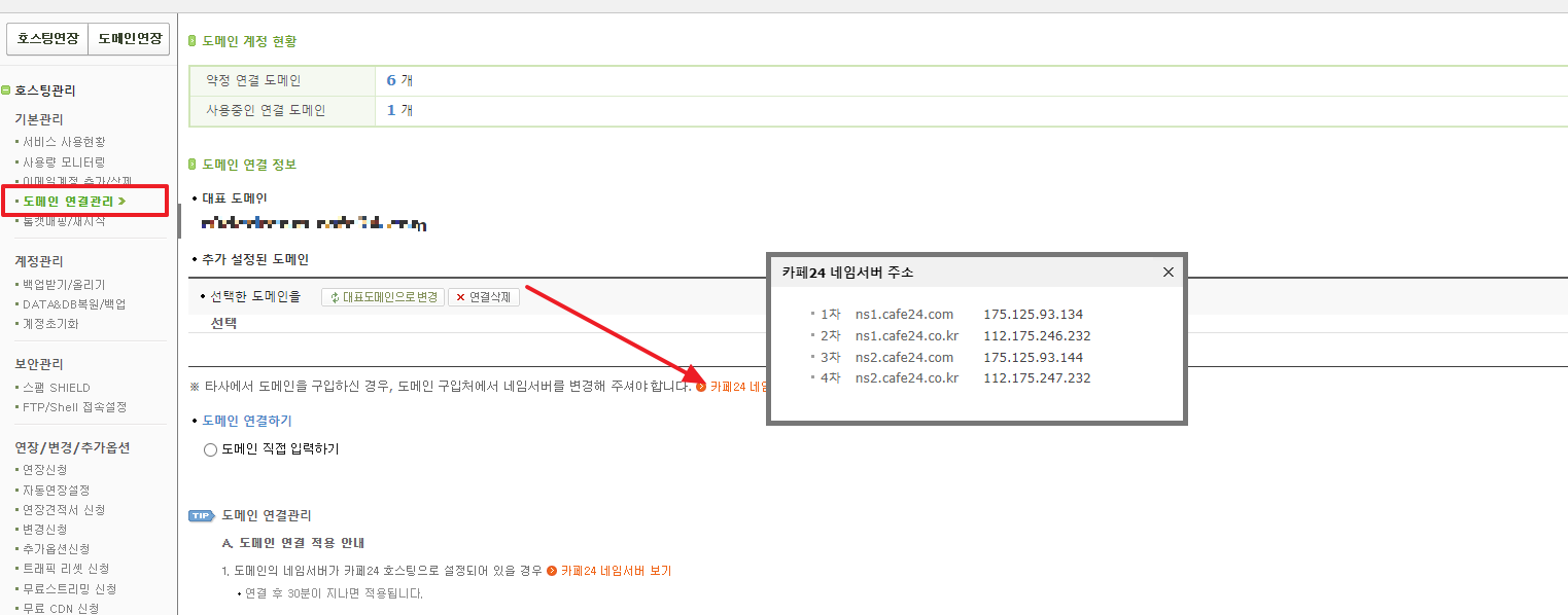 카페24 호스팅 관리에 접속해 도메인 연결관리 - 카페24 네임서버 주소를 확인하여 내용을 입력합니다.