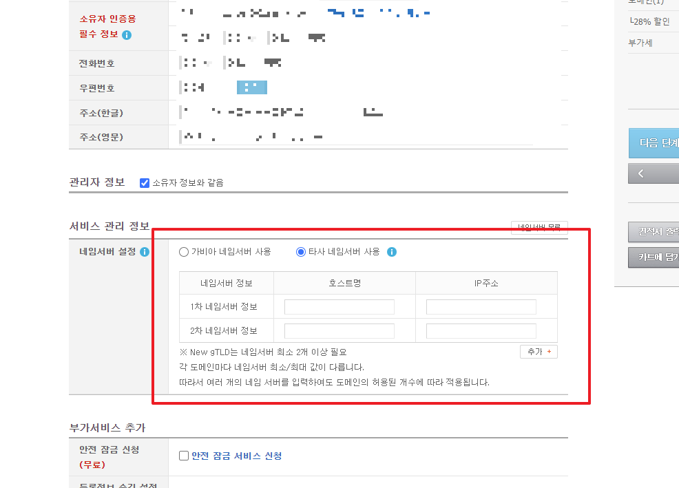 서비스 관리 정보에 네임서버 설정 - 타사 네임서버 사용을 선택합니다.