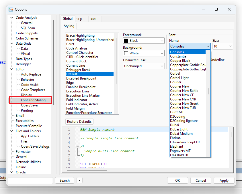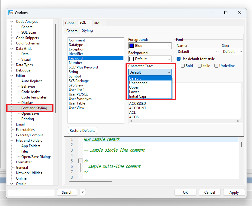 Editor - Font and Styling - SQL - Styling - Keyword - Character Case 변경