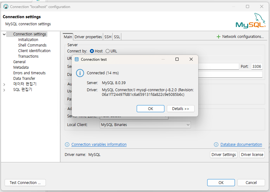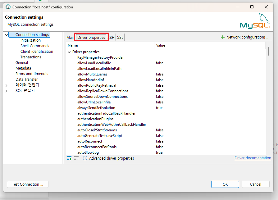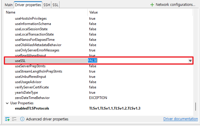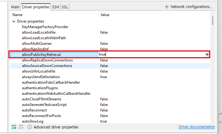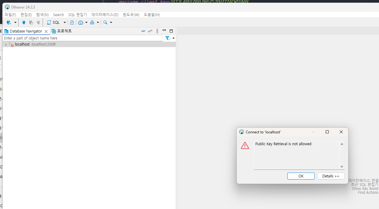 Tip DBeaver Public Key Retrieval is not allowed - 반응형 MySQL 8버전 이상부터 DBeaver 연결시 발생할 수 있는 오류입니다. 해당 오류는 보안 상의 이유로 설정된 기본값 때문입니다. 해결 방법은 다음과 같습니다. 1. Edit Connection 클릭 후 Driver properties 탭 클릭 2. 설정값 수정 allowPublicKeyRetrieval : true useSSL : false 3. Test Connection 반응형 공유하기 게시글 관리 3인칭시점 저작자표시 비영리 변경금지 (새창열림) 'Tip' 카테고리의 다른 글 앱스토어 앱 삭제하기 (0) 2025.05.08 안드로이드 애뮬레이터 그래픽 깨짐 현상 (0) 2025.01.15 SQL Server 영어 간격 벌어짐, 자간 이상 현상 (0) 2024.10.10 [IntelliJ]Tomcat 로그 한글 깨짐 해결 (0) 2024.08.29 [Toad]기본 설정 (1) 2024.08.28 Contents 연관 포스팅 앱스토어 앱 삭제하기 2025. 5. 8. 안드로이드 애뮬레이터 그래픽 깨짐 현상 2025. 1. 15. SQL Server 영어 간격 벌어짐, 자간 이상 현상 2024. 10. 10. [IntelliJ]Tomcat 로그 한글 깨짐 해결 2024. 8. 29. 댓글 0 + 이전 댓글 더보기