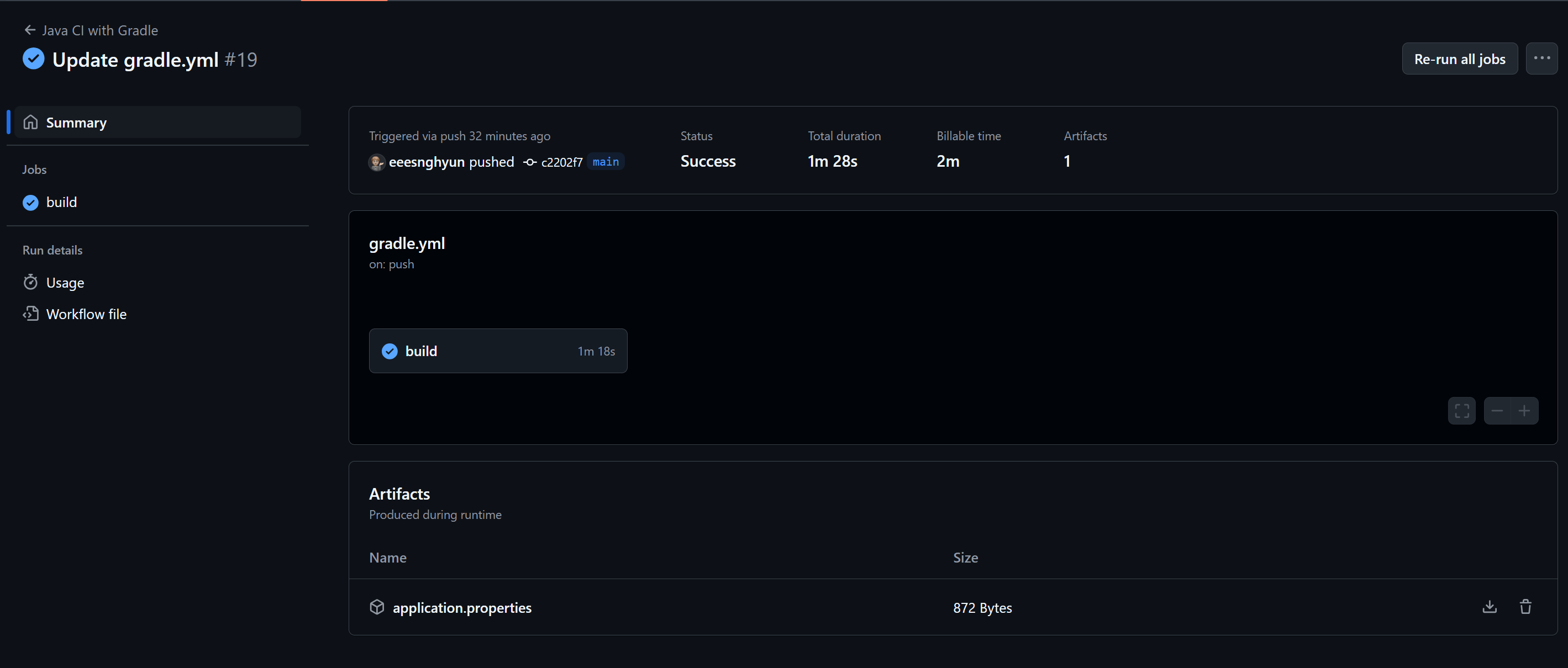 이제 main 브랜치로 Push가 발생하게 되면 아래와 같이 build가 실행됩니다.