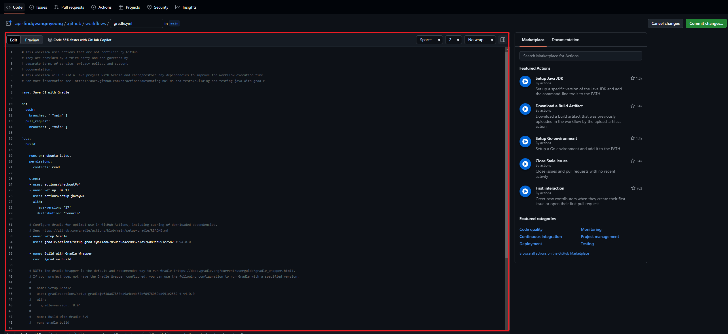- actions/setup-java@v4 : Java 개발에 필요한 도구를 설치