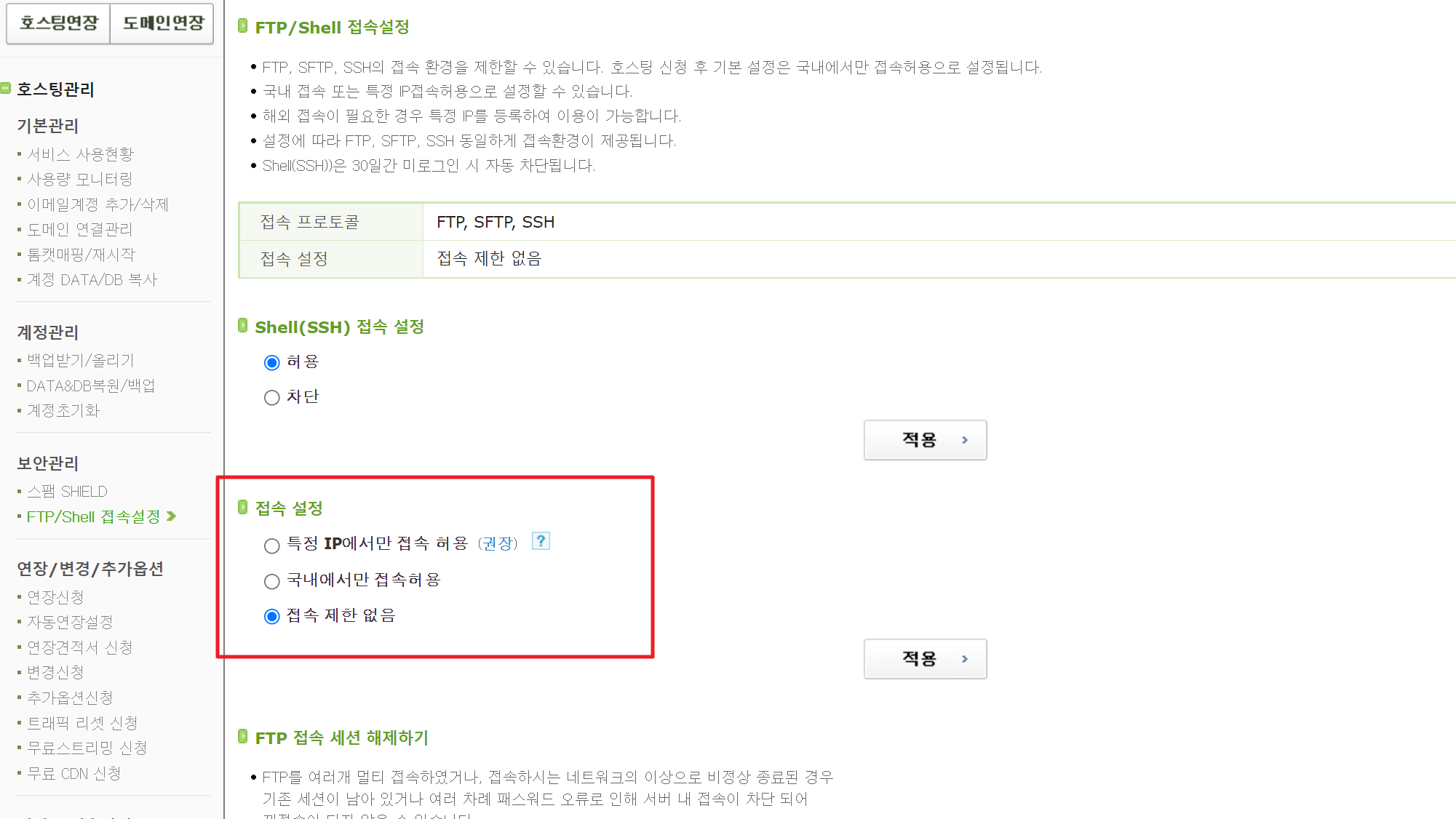 FTP를 통해 업로드되는 서버는 Cafe24입니다. Deploy 부분에서 몇번의 오류가 있었는데 오류의 원인은 Cafe24의 접속 설정을 수정함으로써 해결할 수 있었습니다. 해당 부분의 접속 제한을 해제합니다.