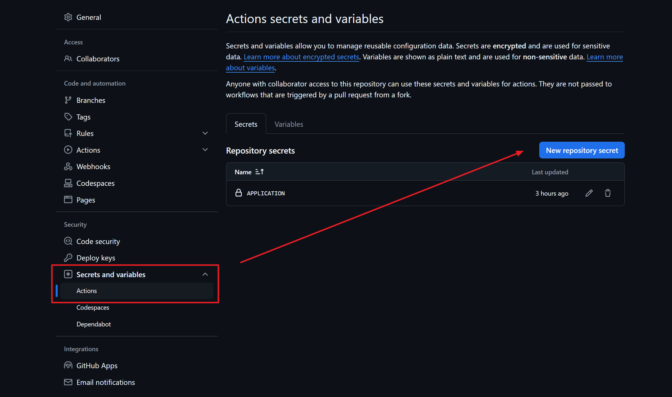 저장소에서 Settings - Secrets and variables - Actions을 통해 환경변수를 등록합니다.