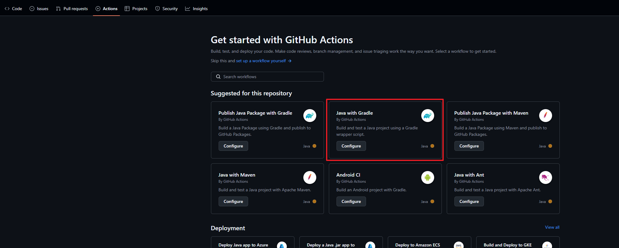 저장소에서 Actions - Java with Gradle 클릭합니다.