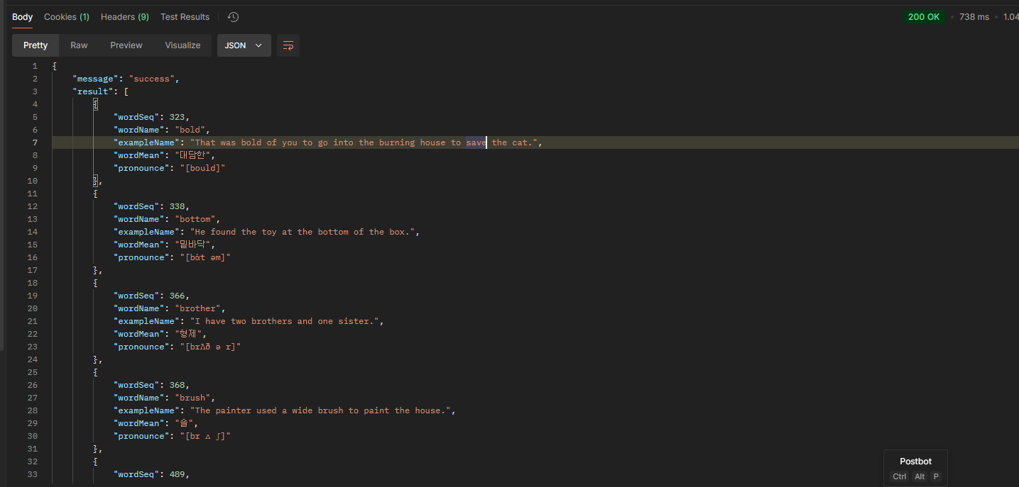 예제에는 하루단어에 사용되는 API를 사용했습니다. API 호출시 단어 리스트를 응답받을 수 있습니다. 사용된 DTO, Controller는 다음과 같습니다.