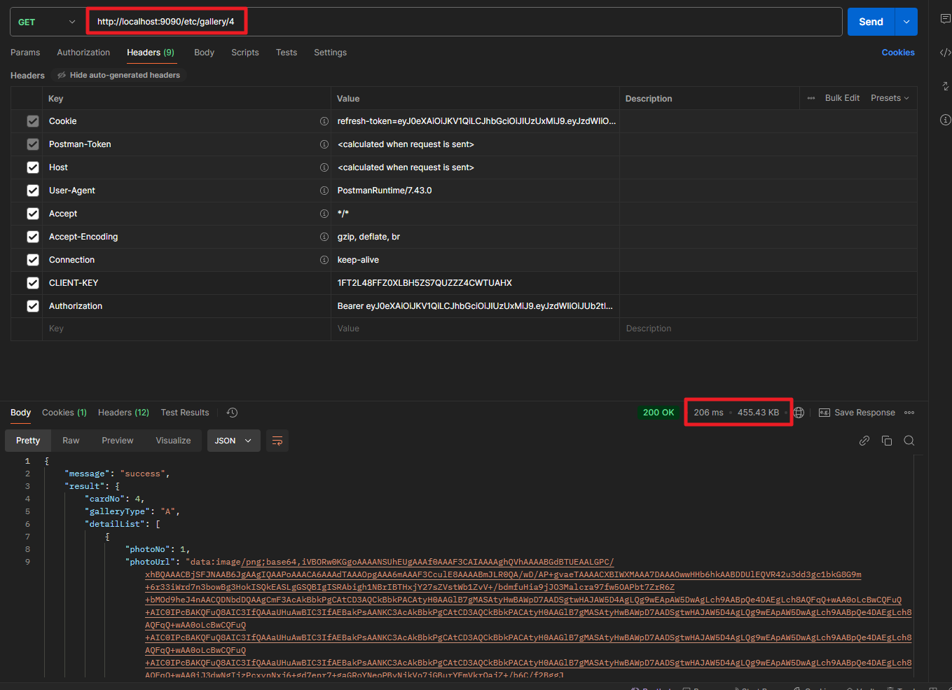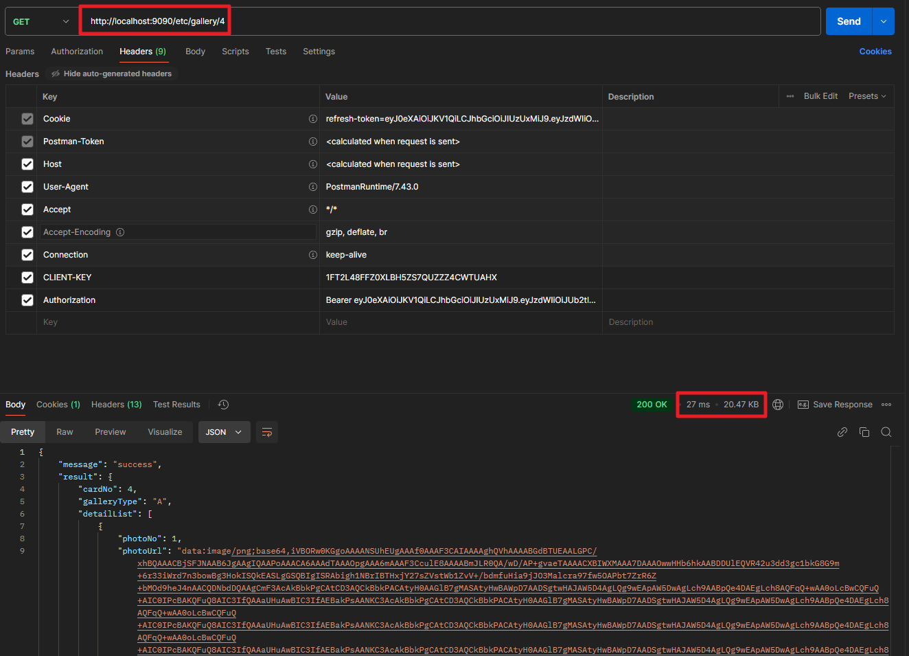 /gallery/4 호출시에는 압축된 압축 크기를 확인할 수 있으며, /etc/gallery/4 호출시에는 압축되지 않은 응답 크기가 확인됩니다.