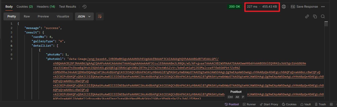 최대 등록 가능한 이미지는 20개로 기획했고, 테스트를 통해 확인했을 때 총 20개의 이미지가 담긴 응답 크기는 455KB( 227ms)로 최적화가 필요한 수준이었습니다.