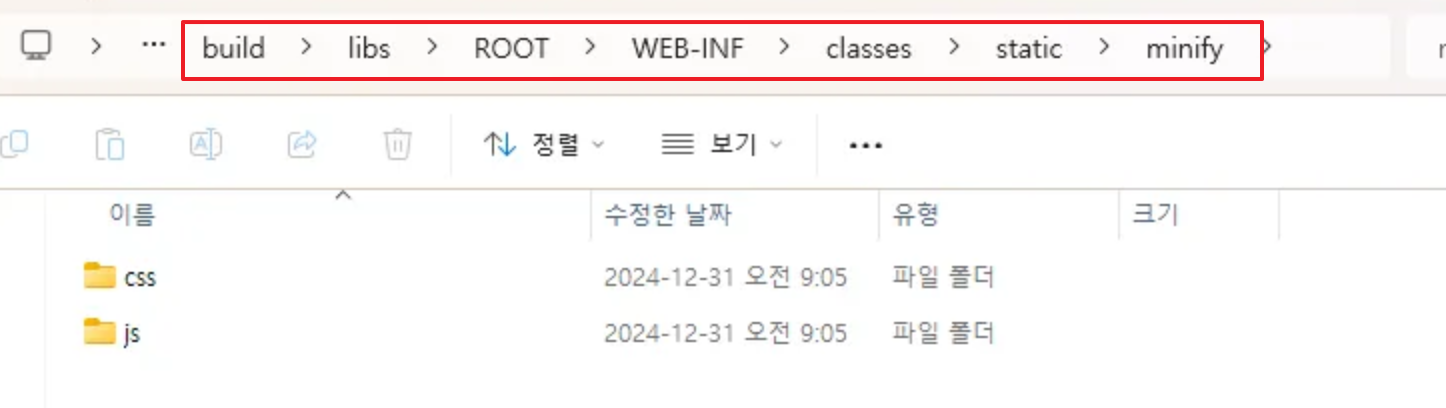 경량화를 통해 생성된 파일을 프로젝트의 target/minified 폴더에 생성됩니다. 이 파일을 빌드를 통해 /resources/static/minify 폴더로 옮기는 방식으로 진행됩니다.