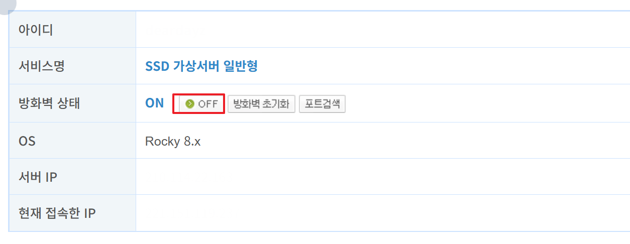 다시 방화벽 관리 메뉴로 돌아가 방화벽 상태를 OFF 후 다시 ON으로 설정합니다. 이 때, 서버에 활성화되어 있는 포트를 체크하여 3306(mysql), 22(ssh) 포트가 INBOUND 상태로 추가합니다.