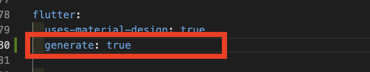 만약 아래와 같은 오류가 발생한다면 pubspec.yaml으로 이동해 flutter 옵션에 generate: true 옵션을 추가합니다.