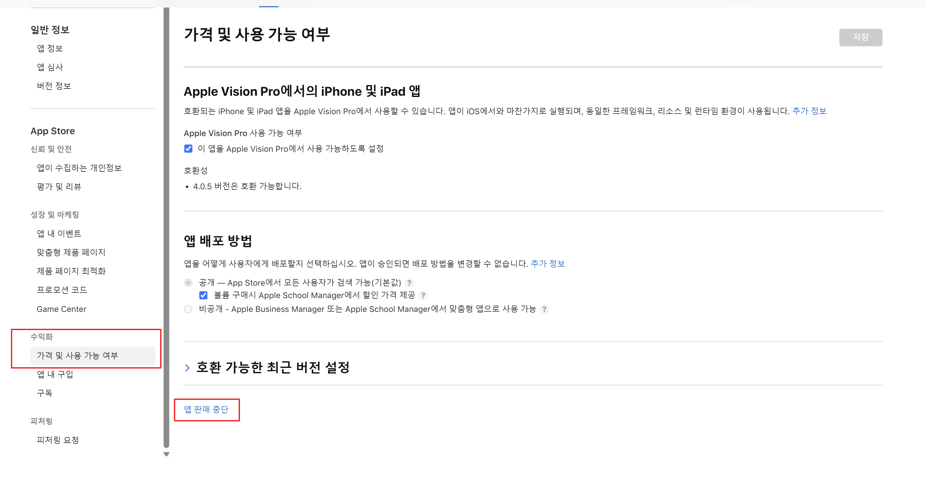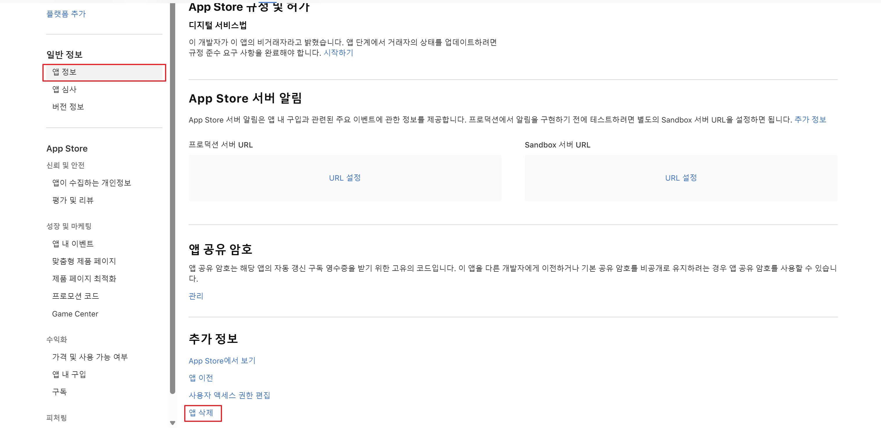 Tip 앱스토어 앱 삭제하기 - 반응형 앱스토어에 등록된 어플 중 오랫동안 관리되지 않고 있는 앱들을 정리해보려 합니다. 어플을 삭제하기 위해서는 먼저 판매 중단을 진행해야 합니다. 해당 앱 정보에 들어가 수익화 - 가격 및 사용 가능 여부 메뉴를 클릭합니다. 화면 하단에 앱 판매 중단을 클릭합니다. 판매 중단 후 일반 정보 - 앱 정보 메뉴를 클릭합니다. 화면 하단에 앱 삭제를 클릭합니다. 삭제를 진행하고 나면 앱 리스트에서 삭제된 앱 조건을 통해 확인이 가능합니다. 반응형 공유하기 게시글 관리 3인칭시점 저작자표시 비영리 변경금지 (새창열림) 'Tip' 카테고리의 다른 글 집단대출 부동산신고필증 발급 방법 (0) 2025.11.10 this is incompatible with sql_mode=only_full_group_by (0) 2025.05.27 안드로이드 애뮬레이터 그래픽 깨짐 현상 (0) 2025.01.15 DBeaver Public Key Retrieval is not allowed (0) 2024.10.23 SQL Server 영어 간격 벌어짐, 자간 이상 현상 (0) 2024.10.10 Contents 연관 포스팅 집단대출 부동산신고필증 발급 방법 2025. 11. 10. this is incompatible with sql_mode=only_full_group_by 2025. 5. 27. 안드로이드 애뮬레이터 그래픽 깨짐 현상 2025. 1. 15. DBeaver Public Key Retrieval is not allowed 2024. 10. 23. 댓글 0 + 이전 댓글 더보기