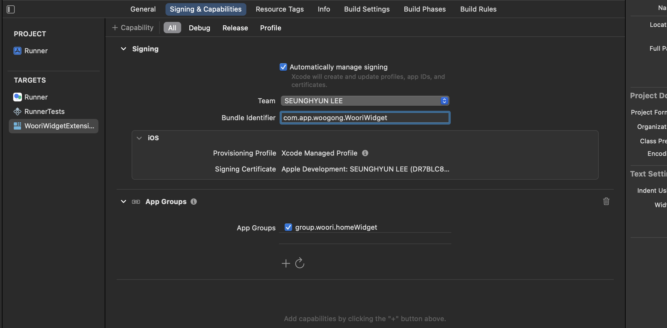 - iOS에서 앱과 위젯 간 데이터를 공유하기 위해 App Group을 설정합니다.