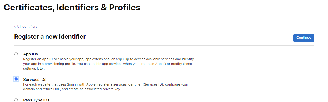 Services IDs 선택 후 Description & Identifier 를 입력해줍니다. 위와 동일하게 Description에는 Service ID를 설명할 수 있는 내용을 적으면 되고 Identifier는 패키지의 역순으로 작성합니다. 위에서 도메인의 역순을 작성했다면 중복 입력이 불가하기 때문입니다.