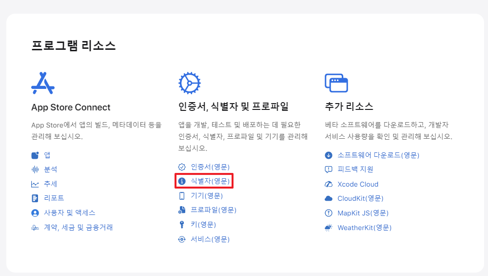 애플로그인을 하기 위해서는 AppId, Key, Service ID를 생성해야합니다. 식별자(영문)에서 먼저 AppId를 만들어보겠습니다.
