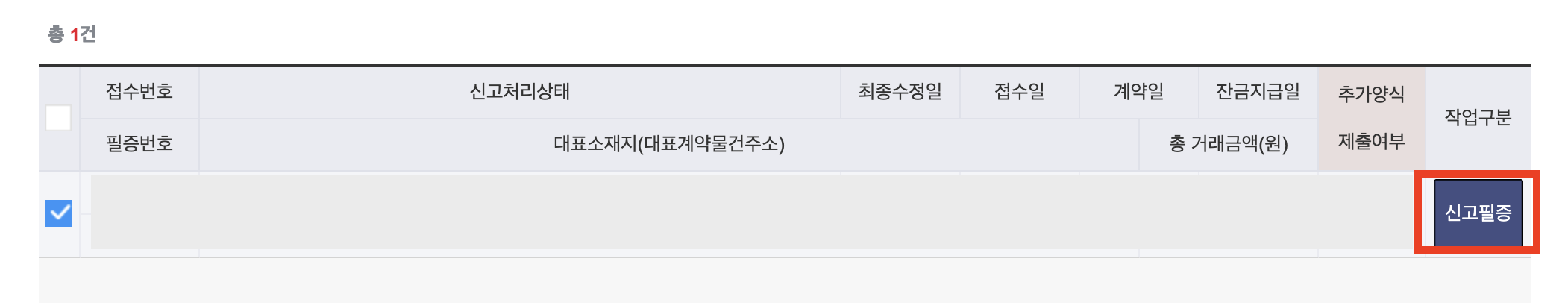 접수건을 체크하고 신고필증을 클릭하면 출력할 수 있습니다.