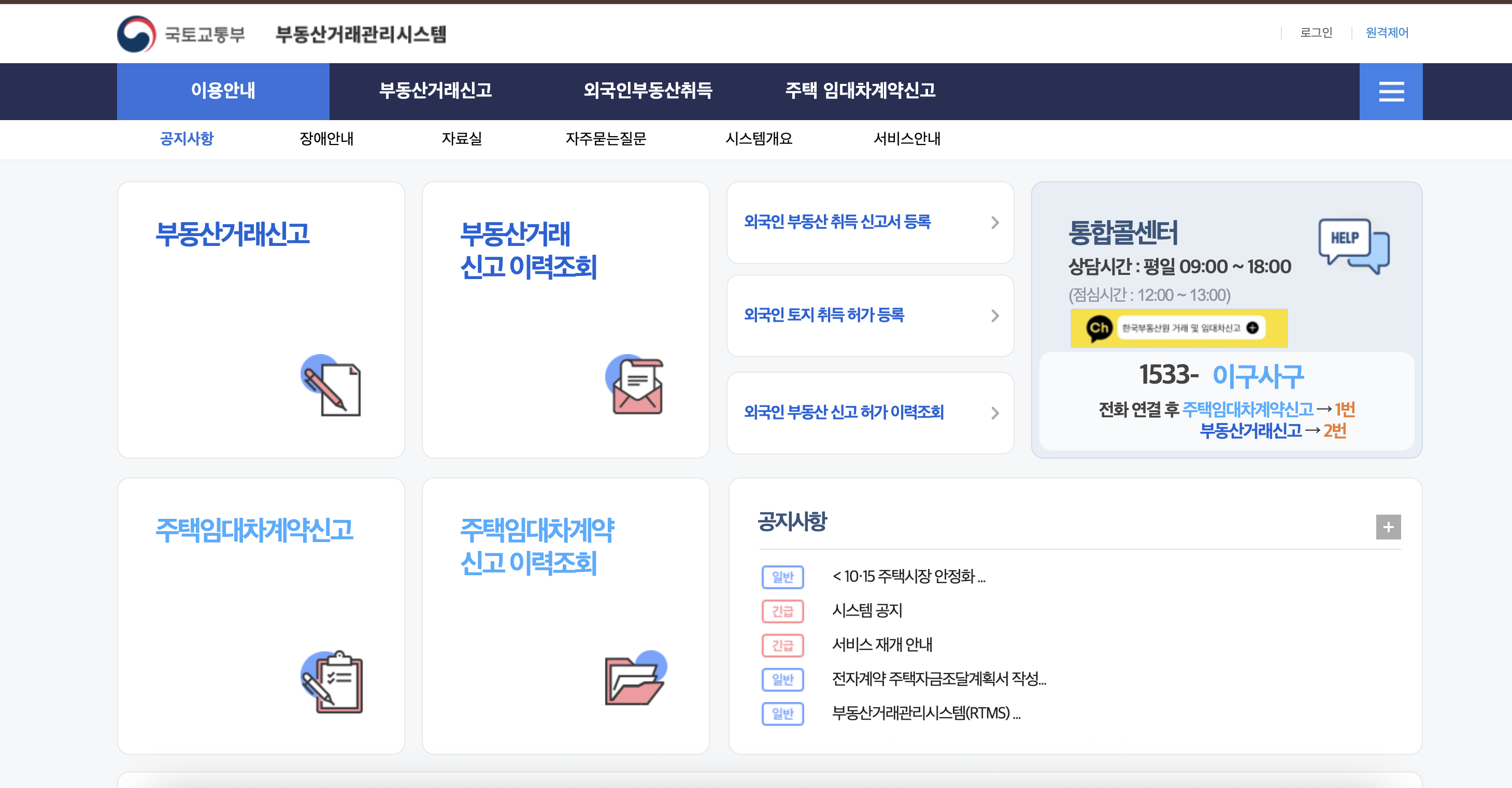 상단 메뉴 중 부동산거래신고 - 신고이력조회 메뉴를 클릭합니다.